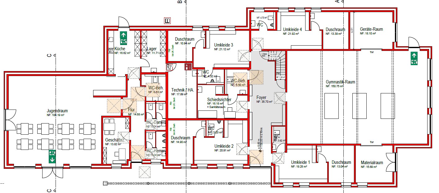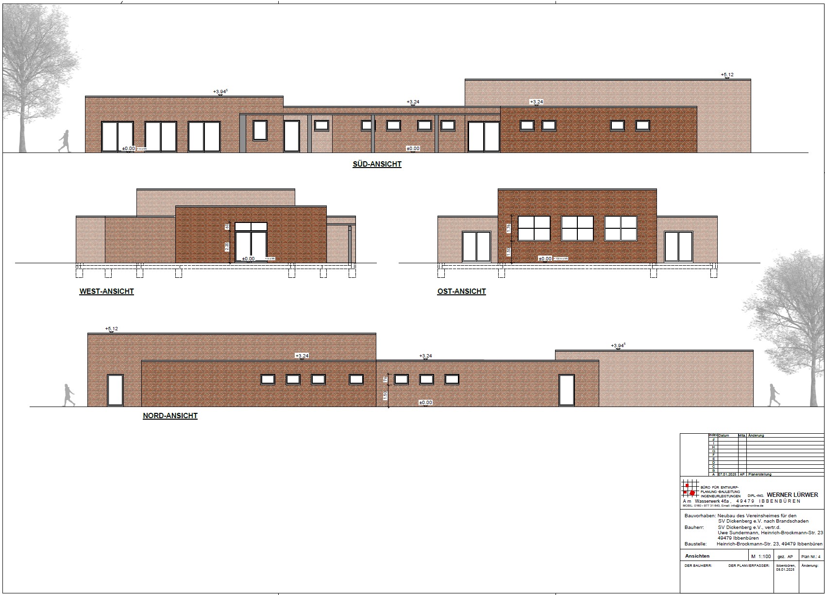 Im Anschluss wurden die Neubaupläne von Architekt Werner Lürwer dann im Detail mit seinen Änderungen gegenüber dem abgebrannten Gebäude erläutert. Diese Vorstellung wurde von Geschäftsführer Uwe Wiethölter vorgenommen. Herausgestellt wurden die wesentlichen Unterschiede und vor allem die Gebäudedetails, die für eine wesentliche Aufwertung gegenüber dem bisherigen Sportheim sorgen. Dies sind u.a. eine voll ausgestattete Küche im Veranstaltungsbereich, behindertengerechte Toiletten, sowie Barrierefreiheit im gesamten Gebäude. Das Highlight wird eine integrierte Gymnastikhalle mit einer Größe von 150 m2.