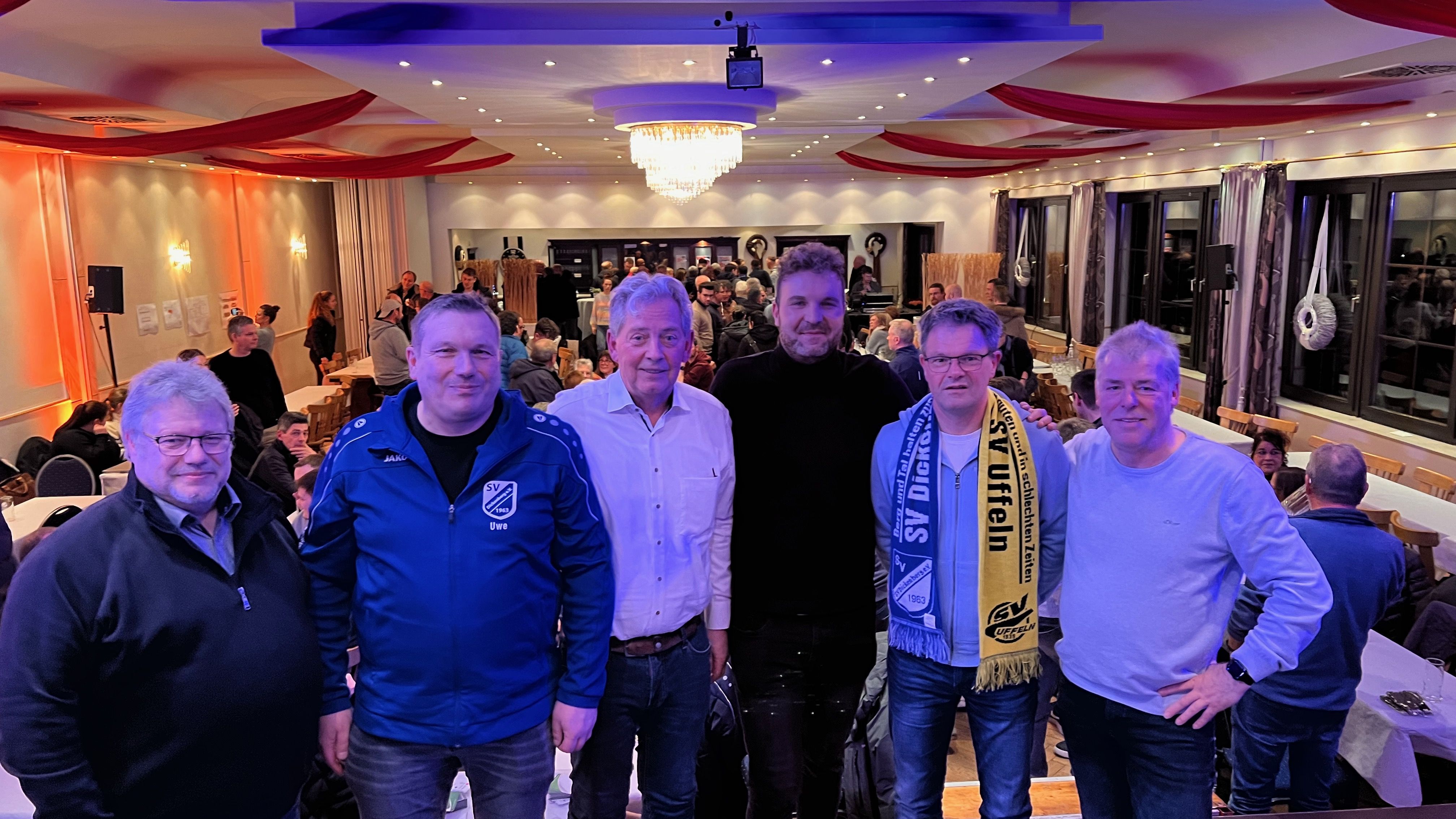 Begrüßen durfte unser 1. Vorsitzende Uwe Sundermann auch Jens Senger und Michael Gröpper vom SV Uffeln. Der SVU hatte sich etwas Besonderes ausgedacht, um unseren Verein zu unterstützen. Es wurde ein Fanschal mit den Vereinsfarben und Logos beider Vereine entworfen. Dieser Schal wurde in den letzen Wochen verkauft und über diese Aktion, bei der der SV Uffeln dann noch den Betrag aufrundete, kamen so 800 Euro zusammen, die mit einem symbolischen Scheck am Freitag übergeben wurden. Uwe Sundermann dankte in seiner Begrüßungsrede den vielen Sponsoren, privaten Spendern, sowie den vielen Vereinen aus der Region, die in ähnlicher Weise wie der SVU seit dem 03. Oktober 2024 den SV Dickenberg unterstützen.