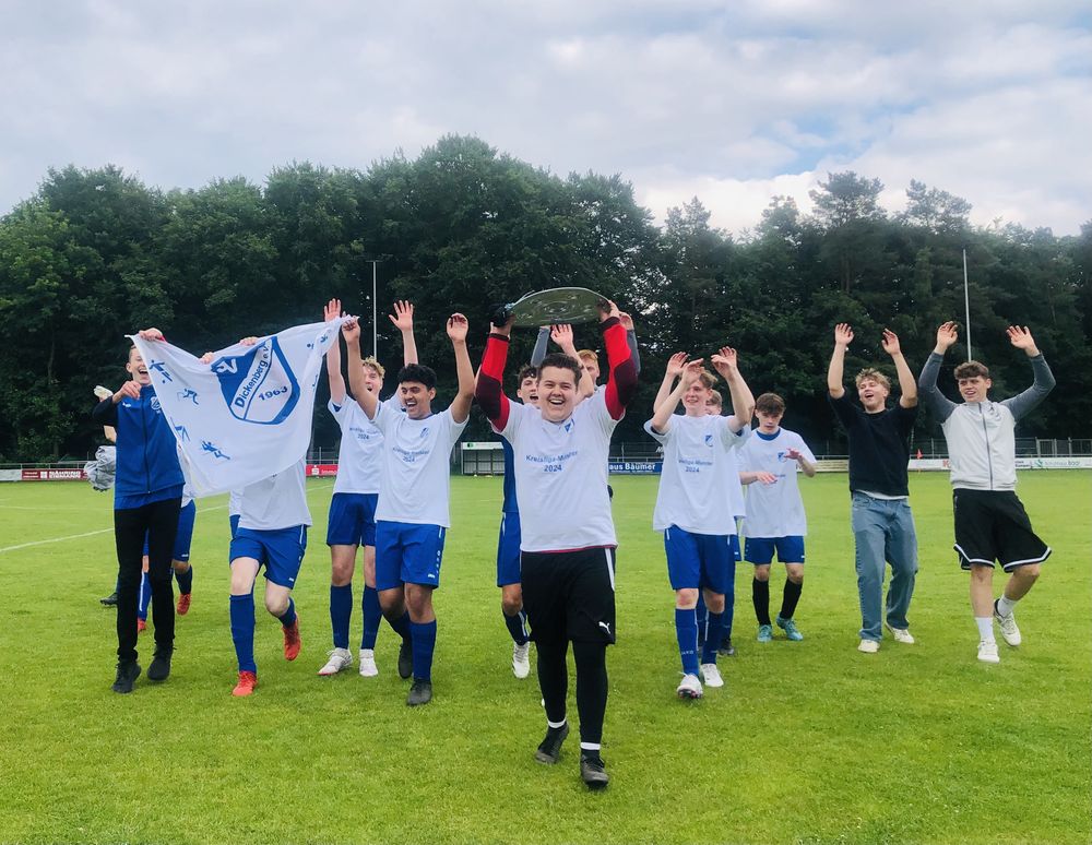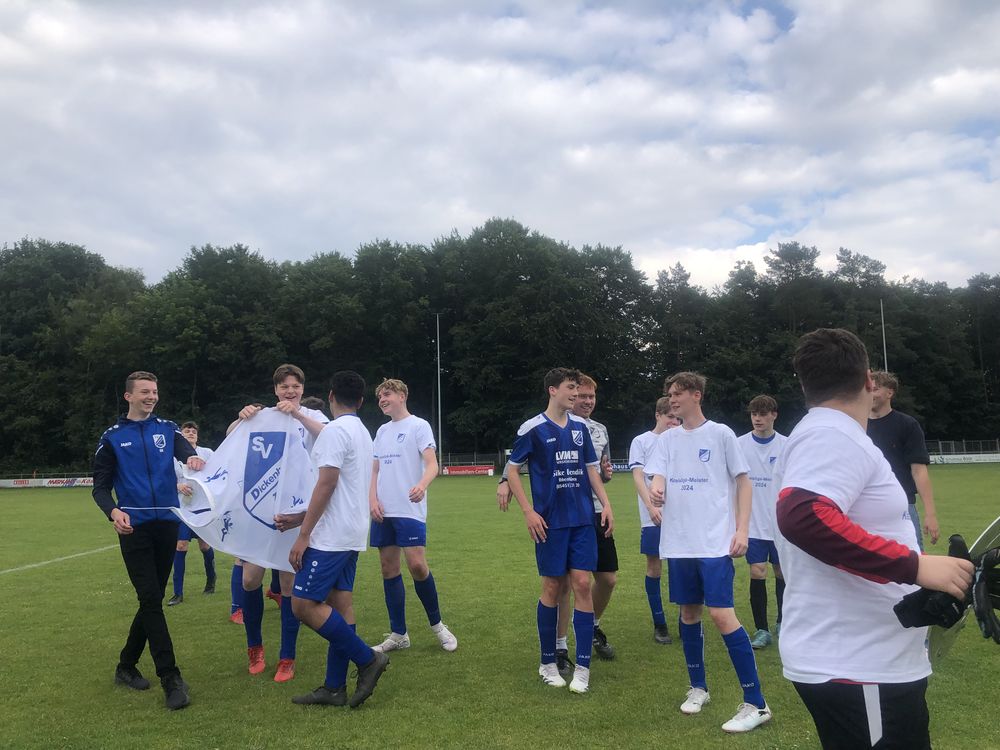 Am 08.06.24 sicherte sich die B-Jugendmannschaft des SV Dickenberg am vorletzten Spieltag der Saison im Spiel gegen TuS Recke mit einem 4:4 die Meisterschaft! Im Zuge des Jugend- Sommerfestes ließ sich die Mannschaft zusammen mit ihrem Trainerteam Paul Kruse, Jan Veit und Jannes Schnieders gebührend von den Zuschauern feiern. Am letzten Spieltag gab es dann gegen den Tabellenletzten JSG Hörstel/Dreierwald II einen ungefährdeten 6:3 Auswärtssieg. Somit konnte die Dickenberger B-Jugend die Saison mit 11 Siegen, 2 Unentschieden und nur einer Niederlage erfolgreich beenden.