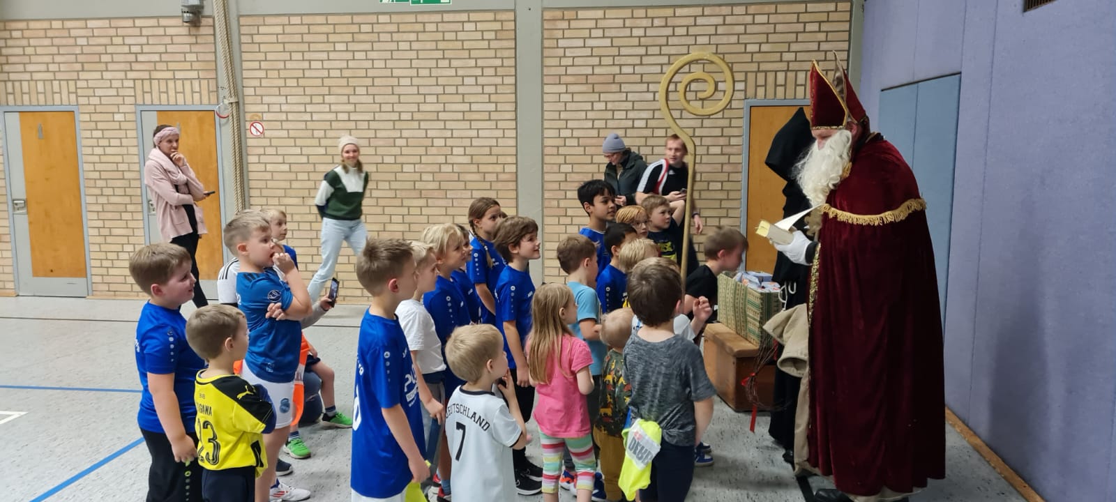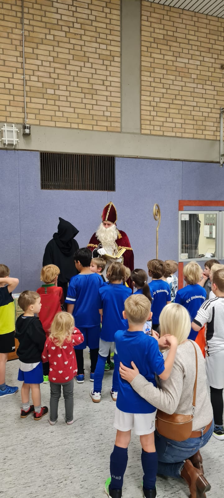 Am Freitag, den 06.12.2024, erlebten die Kinder der G- und F-Jugend des SV Dickenberg ein ganz besonderes Training. Der Nikolaus und Knecht Rupprecht machten Halt in der Barbara-Halle und überraschten die kleinen Fußballerinnen und Fußballer. Mit viel Freude wurde gemeinsam ein Lied gesungen, bevor jedes Kind ein kleines Geschenk erhielt. Die Begeisterung war groß, und alle Kinder freuten sich über den besonderen Besuch.