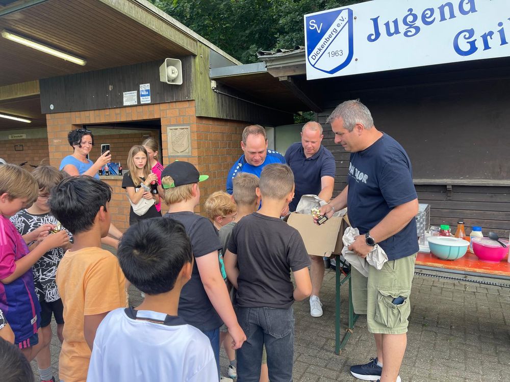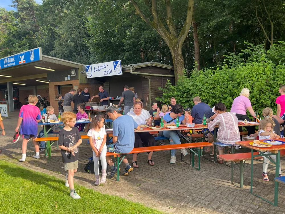 Die erfolgreiche Saison musste natürlich mit einem Abschlussfest gebührend gefeiert werden. Da durfte das Fußball-Dart und ein Grillbuffet natürlich nicht fehlen. Die Kinder konnten sich an dem Abend mit kleinen Geschenken von den beliebten Trainern verabschieden und bedanken. Im Gegenzug überraschten die Trainer dann unsere Nachwuchsspieler:innen mit „goldenen“ Pokalen, die mit vollem Stolz entgegengenommen wurden. Der besondere Clou des Abends war dann das Fußballspiel Eltern/Trainer gegen Kinder. Nicht nur die Kinder genossen das wilde und schweißtreibende Rennen hinter dem Ball. Die motivierten Mütter und Väter gaben alles, so dass auch mal ein Ballerina Schuh beim Torabschluss mit übers Feld flog. Spieler des Abends war Julien Bitter der unermüdlich von Anfang bis Ende mit den Kindern auf dem Platz Fußball spielte und die Kinder begeisterte.