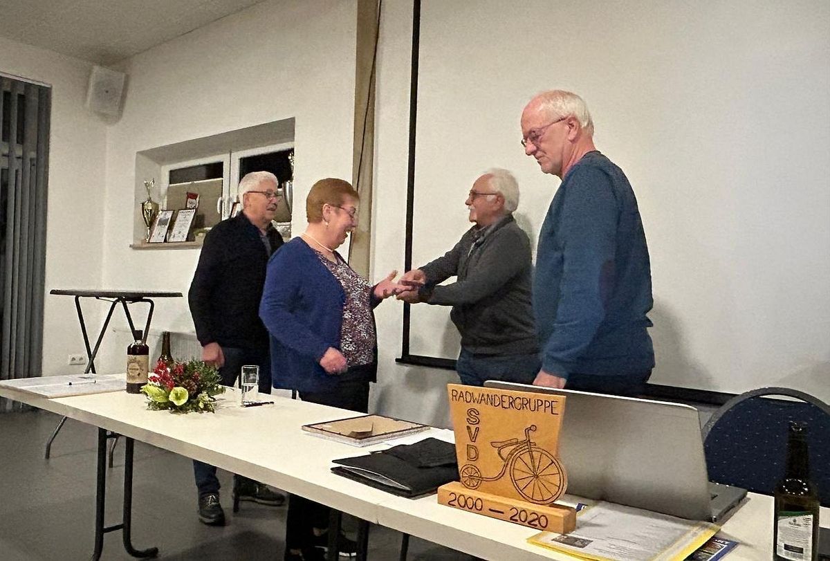 Im Anschluss wurde der Kassenbericht von Kassenwartin Hildegard Lammers vorgetragen. Stabile Lage und eine einwandfreie Kassenführung wurde ihr bescheinigt. Während des Rückblicks ging der Vorsitzende auf die vielen, schönen Radtouren ein und bedankte sich bei den Tourenführern(innen) für ihr Engagement. Alle 23 Radtouren haben stattgefunden und im Schnitt nahmen 19 Teilnehmer teil. Inge u. Hubert Neuhaus hatten nur einmal gefehlt und somit ca. 1000 km zurückgelegt. Außerdem bedankte sich der 1. Vorsitzende bei Ruth u. Reinhold Bäumer für die Begleitung mit dem Marketenderwagen und der Vorbereitung der Mittagspause im Schlosspark Fürstenau, auf der 2-Tagestour nach Löningen.