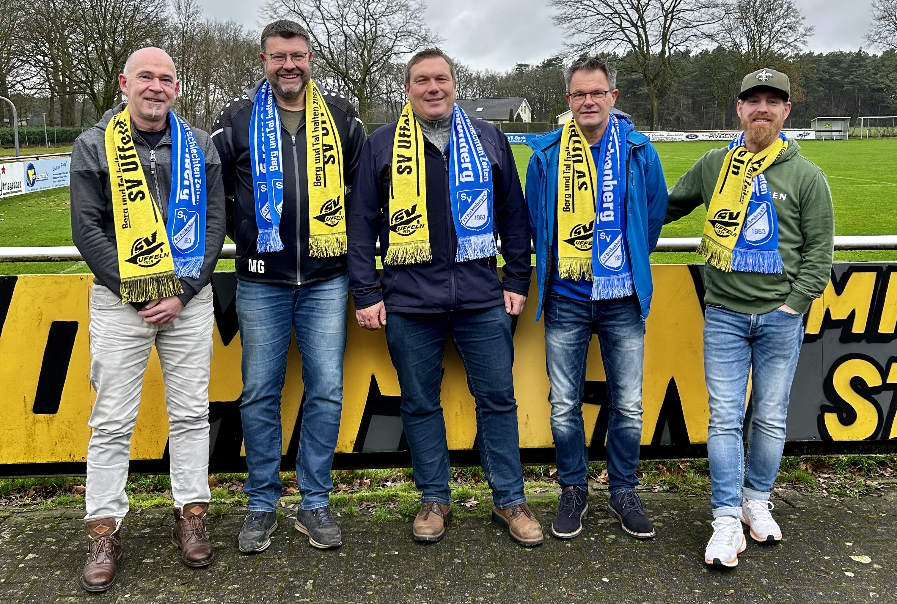 Nach dem Sportheimbrand auf dem Dickenberg wollte auch der SV Uffeln als Zeichen der Verbundenheit ebenfalls einen Beitrag zum Wiederaufbau leisten. Dazu hat sich der Vorstand des SVU etwas besonderes einfallen lassen. Es wurde ein Fan-Schal designt, den es seit dem 21. Dezember dort zu erwerben gibt. Die Hälfte des Kaufpreises (20 €) soll dann dem SVD zum Wiederaufbau zur Verfügung gestellt werden. Zur Verkaufsaktion am letzten Samstag vor Weihnachten machten sich aus dem Dickenberger Vorstand auch Rüdiger Gövert, Uwe Sundermann und Ingo Strauch auf den Weg zum Sportheim Uffeln.
